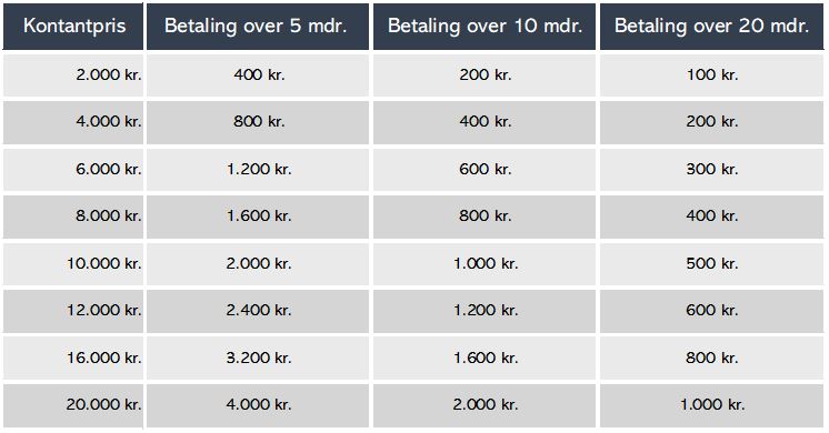 En regning på f.eks. 10.000 kr. koster 500 kr. i 20 måneder. De samlede kreditomkostninger er 0 kr. Det samlede kredit- og tilbagebetalingsbeløb er 10.000 kr. Fast debitorrente og ÅOP er 0,00%.
